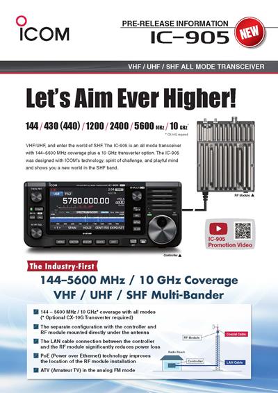 VHF/UHF, and enter the world of SHF. The IC-905 is an all mode transceiver with 144–5600 MHz coverage plus a 10 GHz transverter option. The IC-905 was designed with ICOM’s technology,  spirit of challenge, and playful mind and shows you a new world in the SHF band.