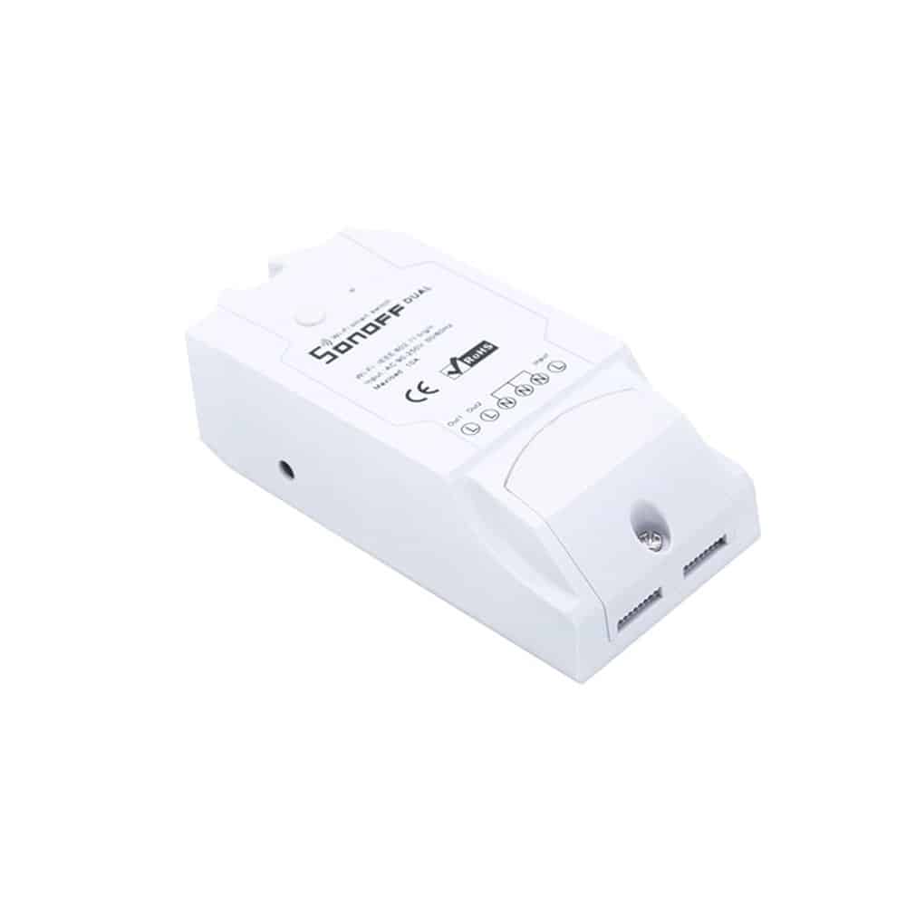 SONOFF DUAL R2 is a 2-output switch that supports control of 2 electrical outputs rated at 90-250V (50/60 Hz) at maximum 10A per output (total load 16A). Each output can be turned on or off separately by by buttons on the unit or using the free iOS/Android App eWeLink. The eWeLink app also display real-time devices status for each output.