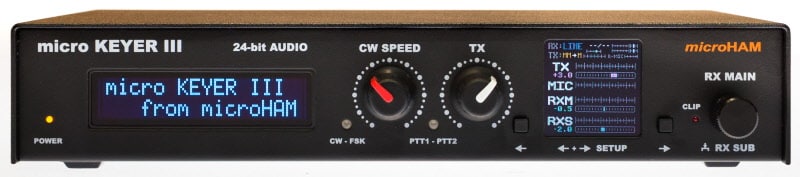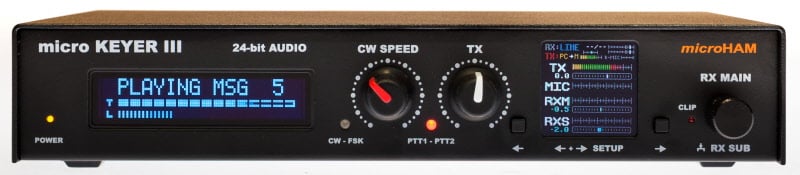 micro KEYER III™ includes a CAT, radio control interface that supports all common standards (RS-232, CI-V, Kenwood and Yaesu TTL), a powerful CW memory keyer using genuine K1EL’s WinKey, a Digital Voice Keyer for SSB, two channel audio processing for transceivers with dual receivers, automatic microphone selection, and a buffer/sequencer for amplifier or LNA control.