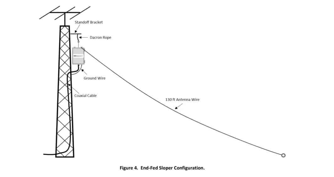 One successful version of the sloper (most folks call any kind of sloper simply a “sloper” regardless of its type) is one that is fed with coax. The antenna is fed from the top and installed on a tower with a beam on top. The center conductor of the coax feeds the sloper wire and the shield is carefully bonded to the tower structure. In addition the beam, rotor, and mast are electrically bonded to the tower (here a heavy braided strap connecting the mast to the tower is recommended). The theory is that the sloper is fed at the top and the high current point is high just under the beam, leading away from the tower.