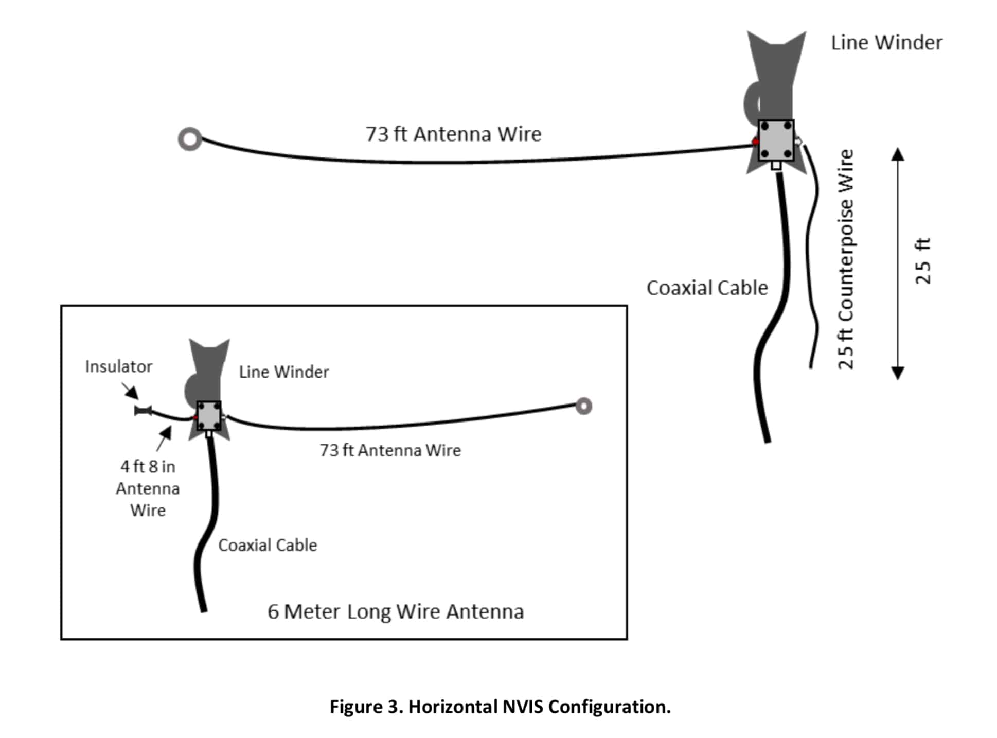 The EMCOMM III Portable antenna Horizontal End-Fed (NVIS) configuration, see figure (3), is a short to medium range HF antenna. The Horizontal End-Fed configuration will provide good NVIS propagation on lower frequencies and medium range sky wave propagation on upper frequencies. It requires two supports and should be mounted at a height of around 25 feet for good overall results. When mounted at this height, the antenna is omni-directional on the lower frequencies and predominantly bidirectional towards the ends of the antenna on the upper frequencies.