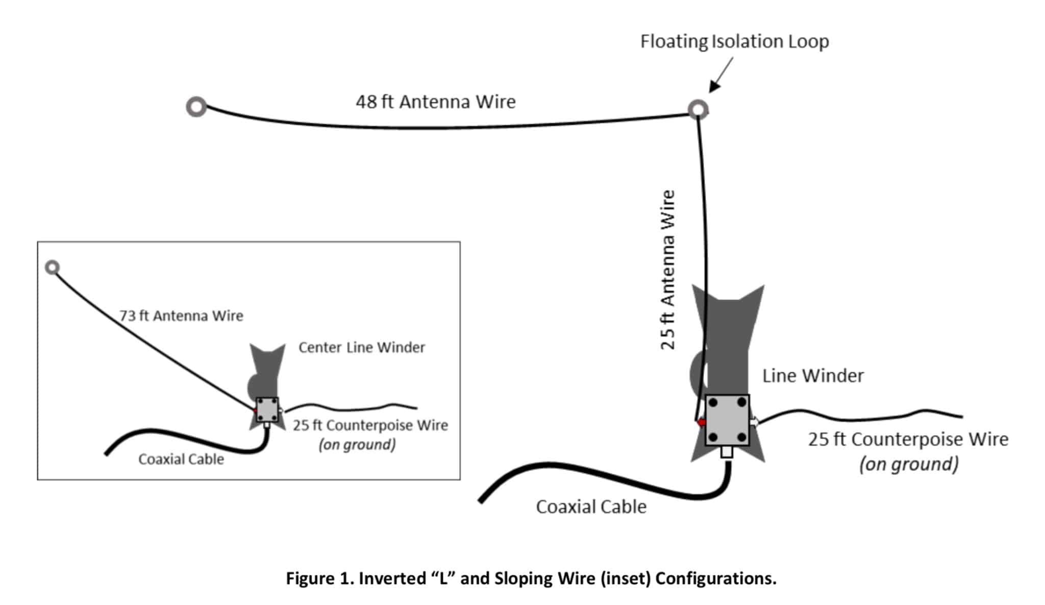 The EMCOMM III Portable antenna, Inverted “L” and Sloping Wire configurations, see figure (1), are medium to long range HF antennas. They should provide acceptable ground wave and sky wave propagation. The Inverted “L” and Sloping Wire configurations are excellent general-purpose antennas and are a good choice when two supports are available (for the Inverted “L”) or one support (for the Sloping Wire) and there is sufficient time for site selection and installation. Installing the antenna at a height of around 25 feet or higher will provide good performance. These configurations are predominately omnidirectional on lower frequencies, slightly favoring the end of the antenna on upper frequencies.