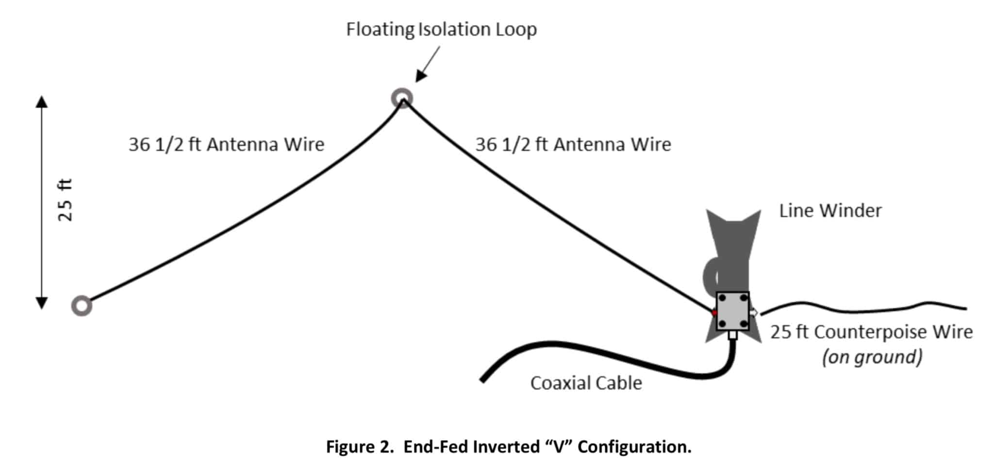 The EMCOMM III Portable antenna End-Fed Inverted “V” configuration, see figure (1), is a medium range HF antenna. The End-Fed Inverted “V” is a good compromise between performance and ease of installation since it requires only one center support, has a reasonably small foot-print, and provides good sky wave propagation. The center should be mounted at a height of around 25 feet and when mounted at this height, the antenna will be omnidirectional at lower frequencies and predominately bidirectional broadside to the antenna on upper frequencies.