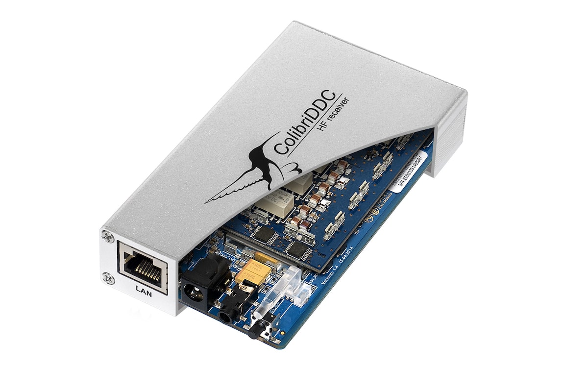 The ColibriDDC is a compact SDR receiver covering 0.09 to 60 MHz and with external filters capable of  receiving frequencies up to 800 MHz. Direct digital signal sampling using a high speed digital to analog converter results in very high performance from a light and small package. The receiver is controlled via LAN and perfect for remote control over a local network or over internet using the RPI Server.
