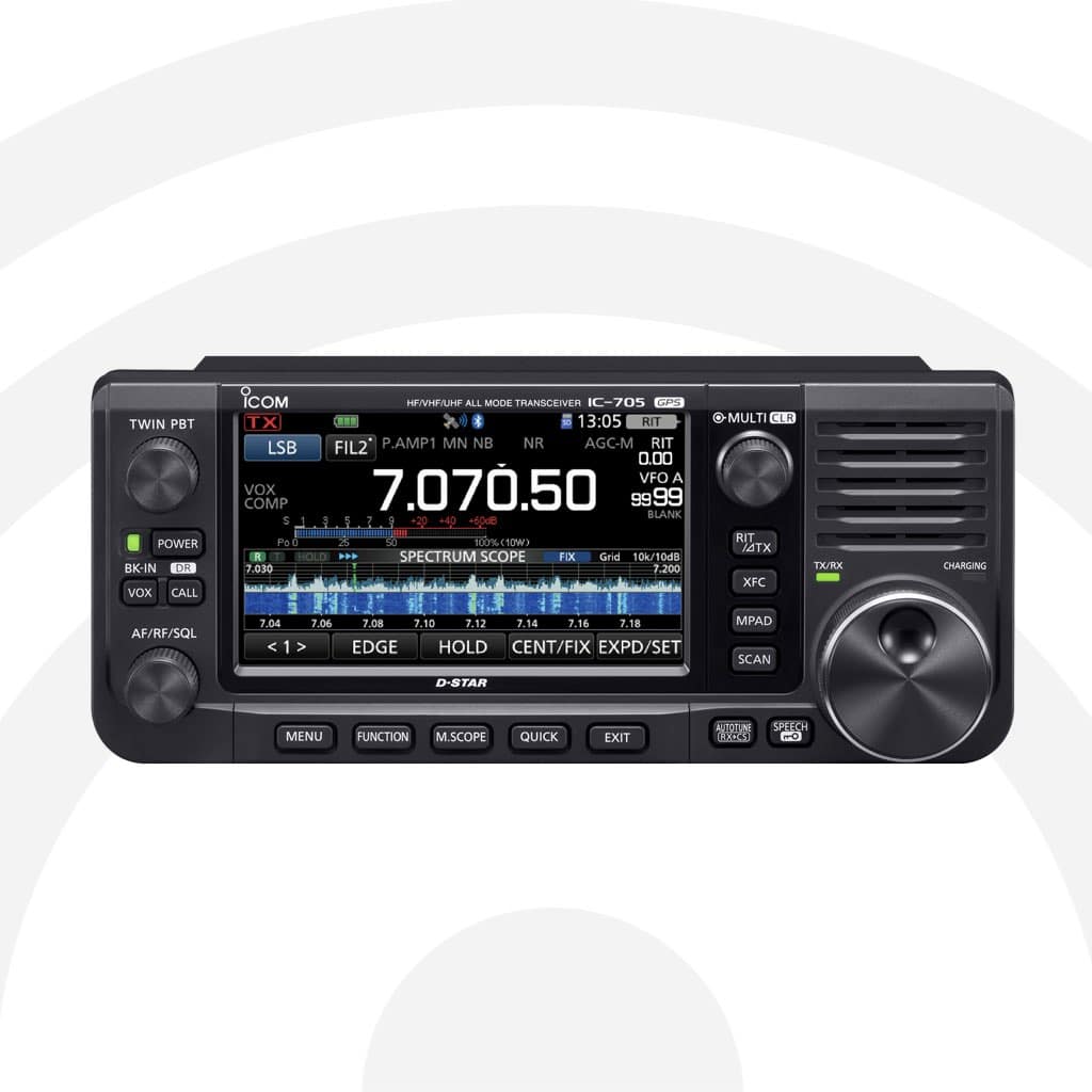 The popular portable HF/VHF/UHF IC-705 has many great features such as SDR platform, internal battery, GPS, Bluetooth and D-STAR, all in a compact and lightweight body. The Icom IC-705 uses the same 4.3 inch colour touch screen display as the best selling IC-7300 and IC-9700 featuring real-time spectrum scope and waterfall display.