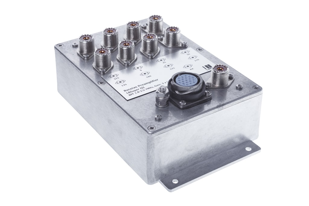 A high quality receive antenna switch with two 12 dB Norton preamplifiers and 7 pole Chebyshev band pass filter for 160, 80 and 40 meter from Low Band Systems. Up to eight receive antennas can be assigned to the radio output.