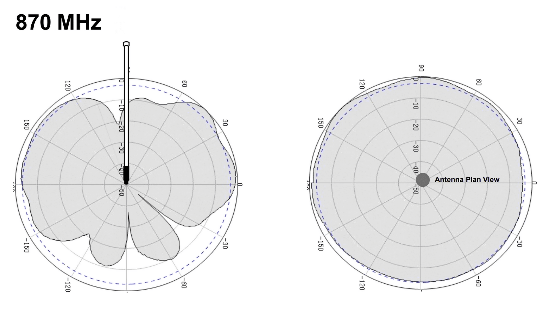 The coverage provided by this antenna makes it ideal for deployment in dense Meshtastic nets with several nodes in the local area and when coverage in close proximity is crucial. Its lower gain is the result of the very broad vertical radiation pattern which makes it efficient for narrow-range signals. While distance is a function of height, the antenna can also be placed low and still will serve top floors on high rise buildings around it.